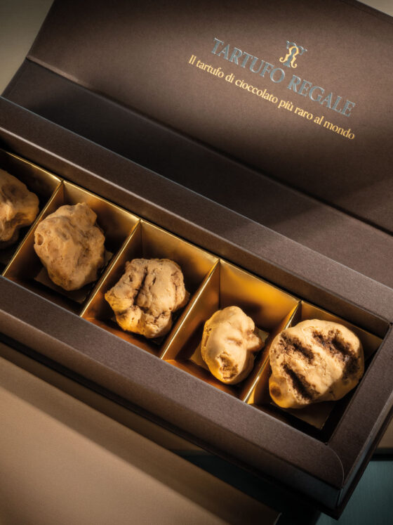 Nato nella villa Reale del primo Re d’Italia Vittorio Emanuele II, il TARTUFO REGALE è una unicità nel settore del cioccolato, riproduce fedelmente per forma e colore un vero tartufo, tanto che nemmeno i “Trifulau” (ricercatori di tartufo) sono in grado di riconoscerlo.