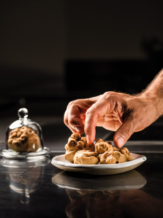 Da questi capisaldi della sua cucina è nato TARTUFO REGALE, un prodotto enogastronomico innovativo e unico, dove il TARTUFO non diventa ingrediente, ma modello per creare una contaminazione estetica che ne sfrutta solo colore e forma, lasciando alla NOCCIOLA, il compito di sbloccare i segreti di una combinazione di sapori unica.