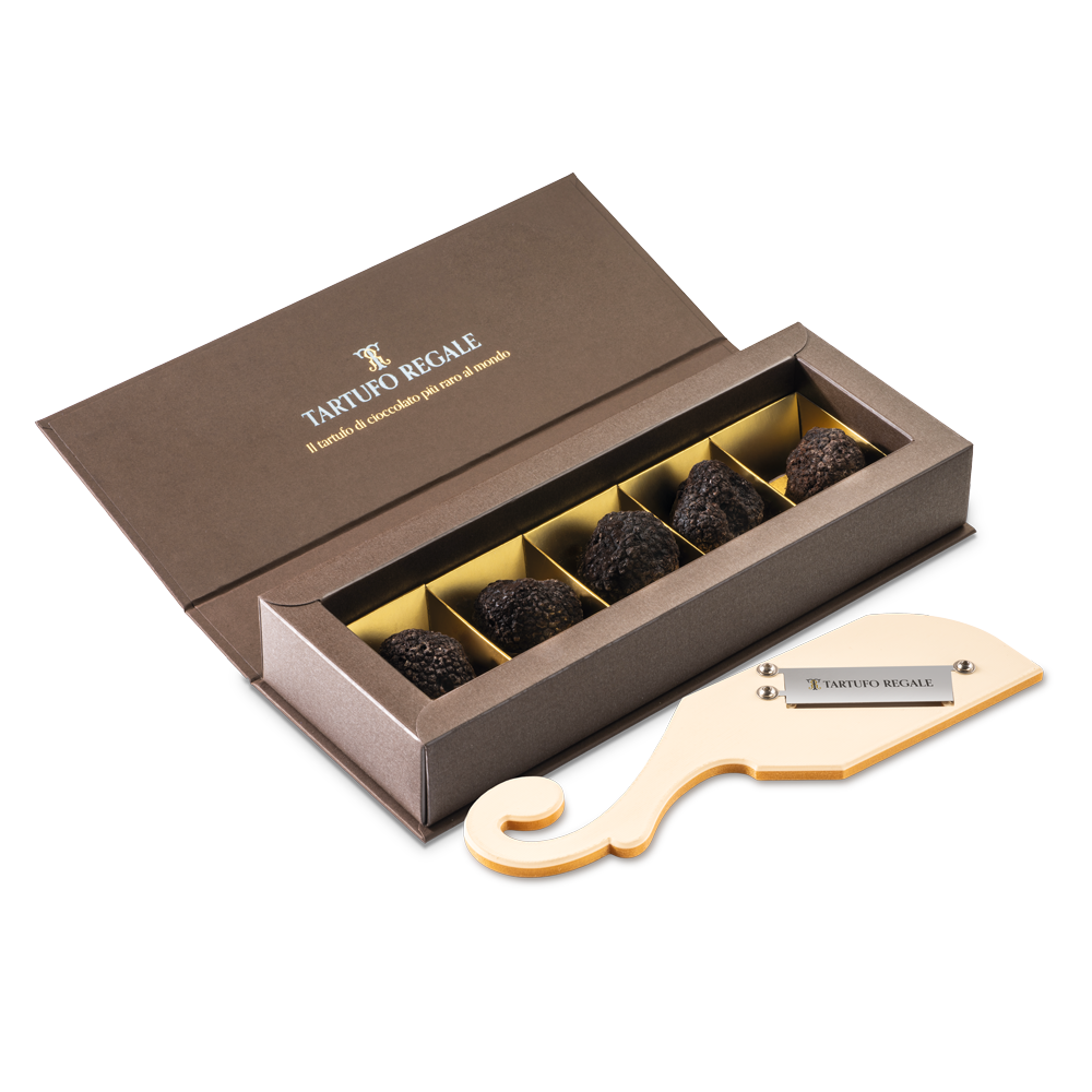 Al suo interno, la selezione di 5 tartufi di forma diversa con lo stesso gusto prelibato di cacao, più raro al mondo, e nocciola IGP Piemonte, a testimonianza dell’altissima artigianalità di Tartufo Regale.